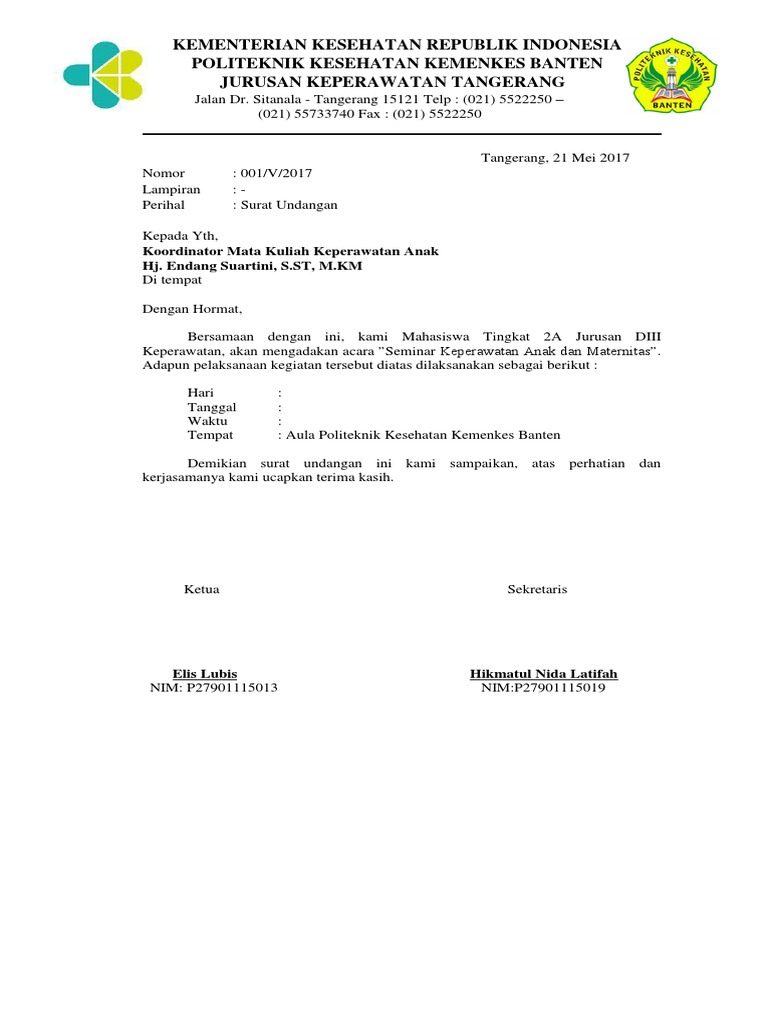 Contoh Surat Undangan Seminar Nasional Sample Surat Undangan from i0.wp.com Surat undangan tidak resmi adalah surat undangan yang biasanya dibuat oleh seseorang atau individu dalam rangka mengundang atau mengajak orang lain untuk menghadiri acara pribadi yang diadakan olehnya, contohnya seperti surat undangan ulang tahun, surat undangan pernikahan dan. Contoh surat undangan resmi sangat banyak, namun pada umumnya memiliki tujuan yang sama, yakni mengundang pihak lain untuk menghadiri sebuah kegiatan. Kepala unit pendidikan kecamatan prambanan. Dan untuk memastikan kehadiran setiap orang, maka berbagai pihak seringkali menggunakan surat undangan resmi. Dari kedua jenis surat ini mempunyai tujuan tersendiri dan tidak dapat digunakan di sembarang tempat. Karena surat undangan lembaga atau organisasi bersifat resmi maka kamu harus mengetahui formatnya dengan contoh surat undangan resmi seminar. Pada contoh di bawah ini adalah undangan kegiatan seminar yang ditujukan kepada ketua program studi. Namun, surat undangan ini masih banyak juga loh yang menggunakan yang mana masih berbentuk oleh hard copy.